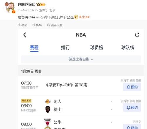 根据媒体人球圈赵探长报道,杨鸣辞职之后,他将火线重回解说席位,将在1月29日与美娜、孔祥宇,一起解说1月29日湖人对阵骑士的焦点NBA比赛。